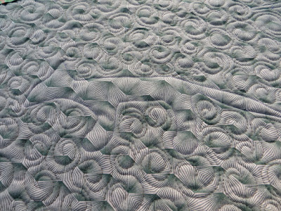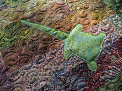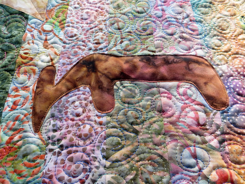 I quilted this piece in a multicolored thread in a spiral pattern, leaving the appliqued shapes unquilted (thus more mound-like).